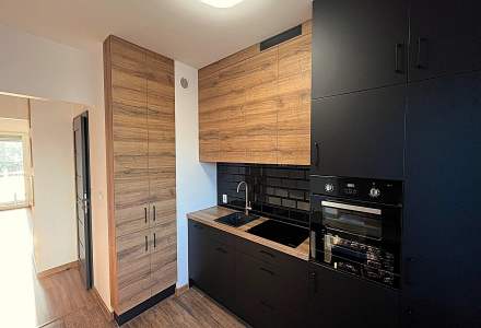 Mieszkanie o ciekawej i nietuzinkowej aranżacji. Na ścianach gipsowa struktura, w salonie drewniane drzwi przesuwne, w przedpokoju nowoczesna szafa na wymiar, podłogi częściowo deska, częściowo panele, drzwi wewnętrzne dębowe, meble w kuchni w zabudowie również dębowe.