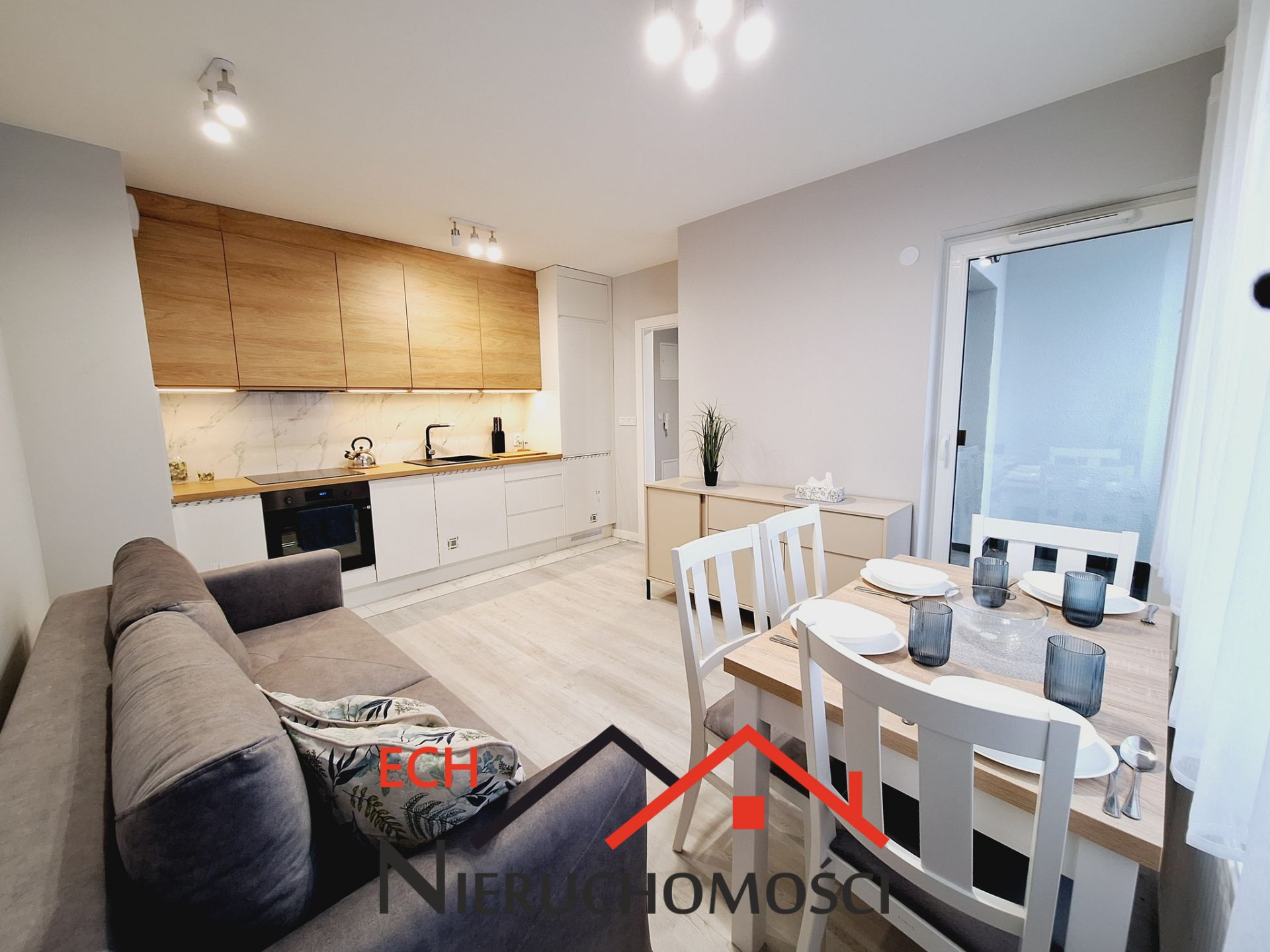 Salon z aneksem kuchennym: stylowo urządzony, z wyjściem na balkon. Kuchnia posiada pełny, nowy sprzęt AGD (lodówka z zamrażarką, zmywarka, płyta grzewcza, piekarnik).